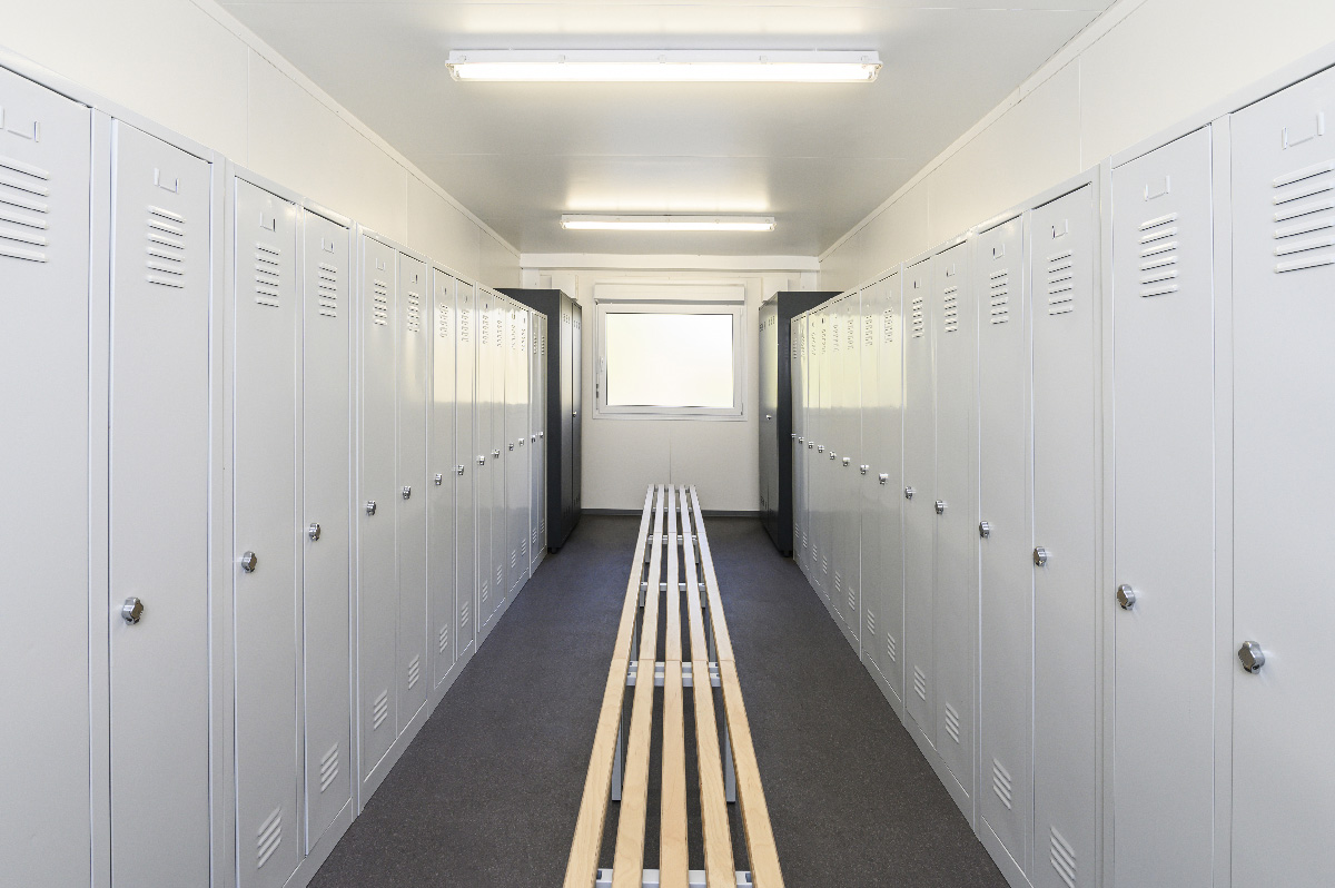 Die zubuchbare Ausstattung besteht aus Stühlen, Einzeltischen, Spinden sowie Kleinküchen oder Küchenzeilen und weiteren Elektrogeräten, die Sie nach Ihren Wünschen zusammenstellen. Zudem bieten wir zahlreiche Individualisierungsmöglichkeiten bei der Innen- und Außengestaltung an. Wählen Sie beispielsweise aus verschiedenen Bodenbelägen, Folierungen, ergänzenden Erweiterungen wie ein Vordach oder eine Attika und diversen Möglichkeiten zur Außengestaltung.