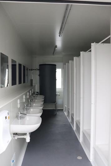 Decke und Wände in Blechausführung in hellem, freundlichem Farbton, hellgrau
