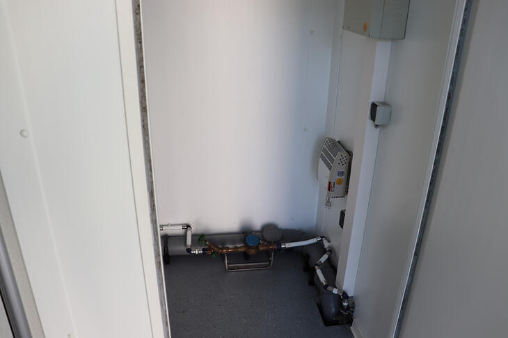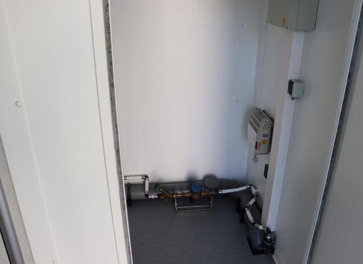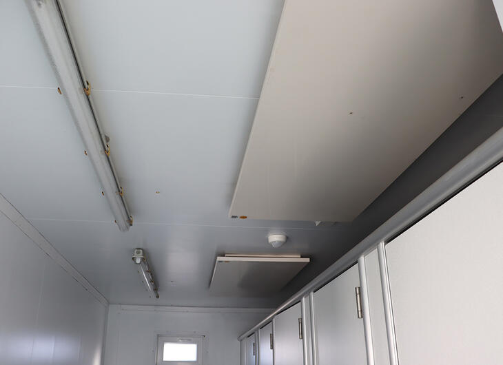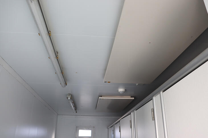 Decke und Wände in Blechausführung in hellem, freundlichem Farbton, hellgrau