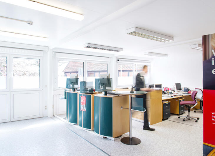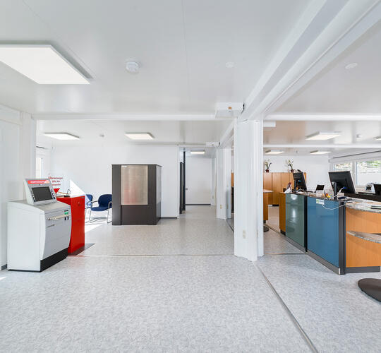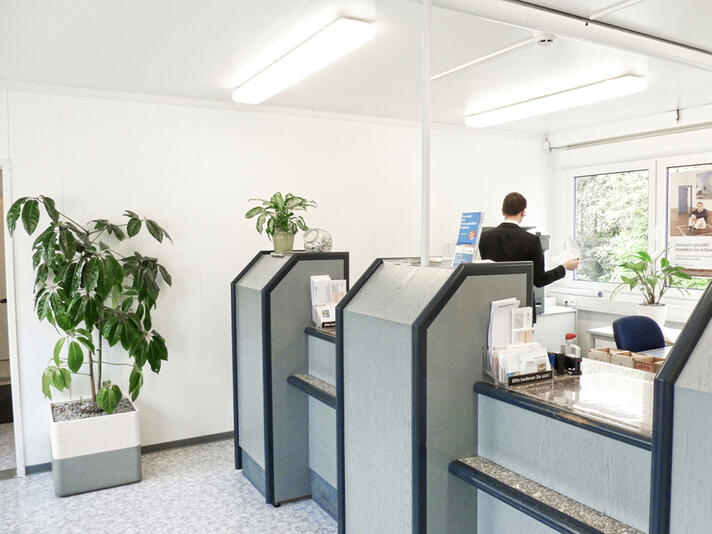 Der repräsentative Schalterbereich in einer ELA Raumlösung für Banken und Sparkassen wirkt dank heller Farbgebung und großzügigen Fenstern einladend und offen. Durch die Kombination mehrerer ELA Container können auch großflächige Empfangsbereiche realisiert werden.