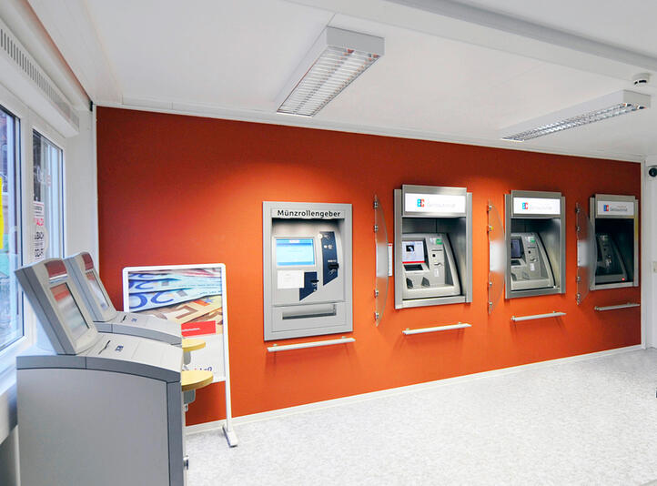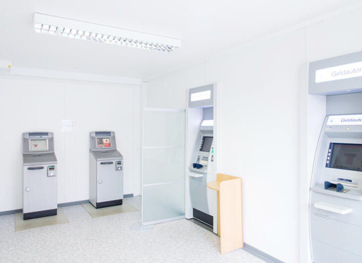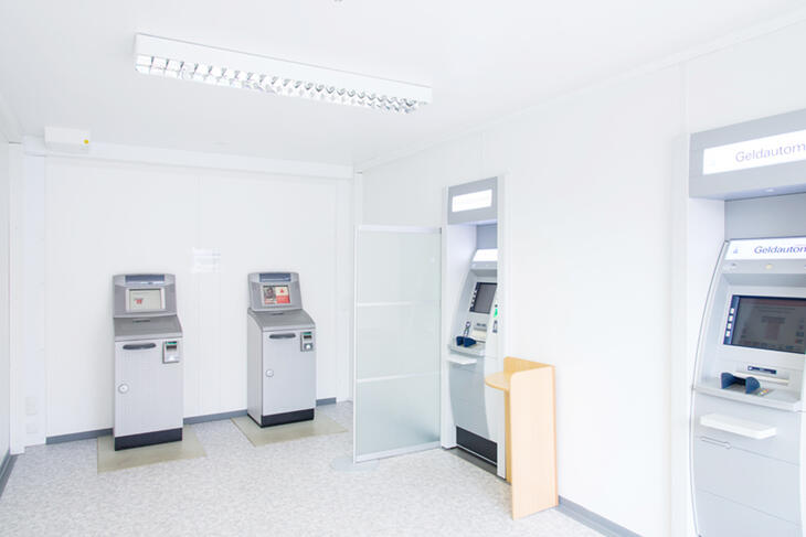 Bankkunden in temporären Bankgebäuden von ELA sind auch außerhalb der Öffnungszeiten ihres Finanzinstituts flexibel. Im Vorraum einer Bank aus ELA Containern lassen sich sicher und ungestört alle Geldgeschäfte erledigen – und zwar rund um die Uhr. Dabei spielt Sicherheit eine wichtige Rolle: ELA stattet den Vorraum auf Wunsch mit LED-Beleuchtung, Bewegungsmeldern und Rauchwarnmeldern aus. Auch die Stromversorgung für die Videoüberwachung und die Automaten bereitet ELA in Containern für Banken und Sparkassen vor.