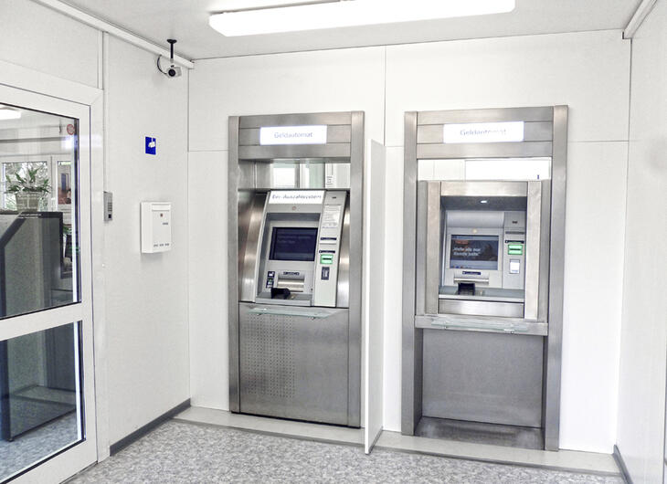 ELA Containeranlagen für Banken und Sparkassen bieten mit einem separaten Vorraum für Geldautomaten, Automaten für Kontoauszüge und Nachttresor eine sichere Raumlösung abseits der Haupträume des mobilen Bankgebäudes.