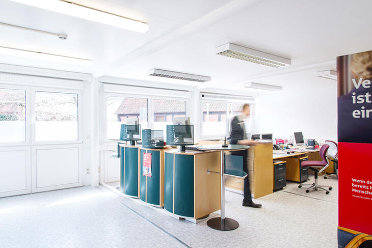 Gutes Raumklima, genügend Licht und eine moderne Ausstattung machen die ELA Bürocontainer zum Kaufen und Mieten zu echten Allroundern. Für temporäre Bankgebäude sind die mobilen Büroräume die perfekte Raumlösung, um während Umbauphasen den Bankbetrieb aufrechtzuerhalten.