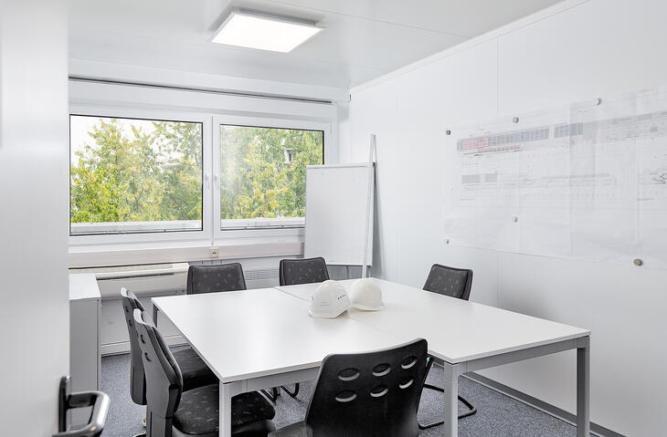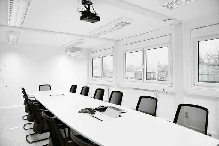 Der Besprechungsraum innerhalb von ELA Containeranlagen ist der ideale Ort zum Arbeiten, Austauschen und Konferieren. Hell, geräumig und ausgestattet mit moderner Kommunikationstechnik, großem Besprechungstisch und bequemer Bestuhlung bietet er optimale Bedingungen. Die Wände der ELA Raumcontainer sind durchgängig magnethaftend. Projektpläne oder Bilder können so einfach an den Wänden des Besprechungsraums per Magnet befestigt werden.