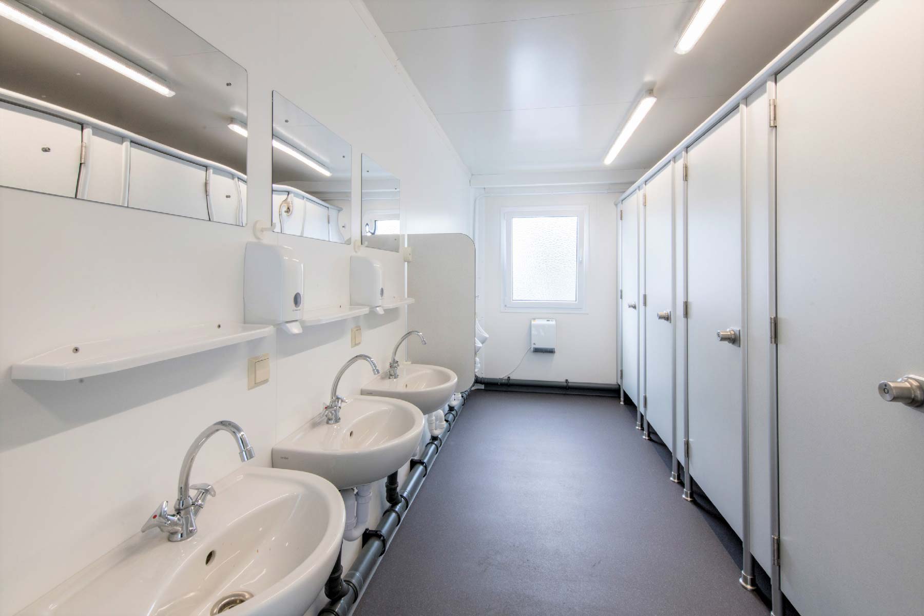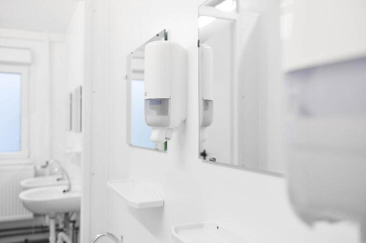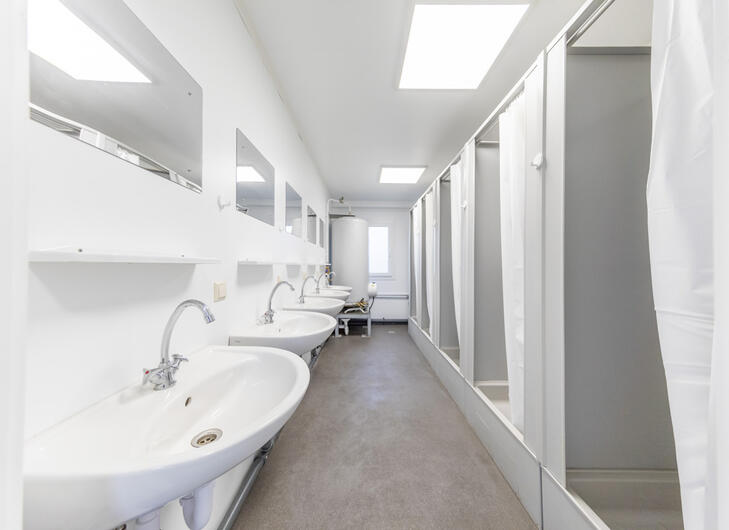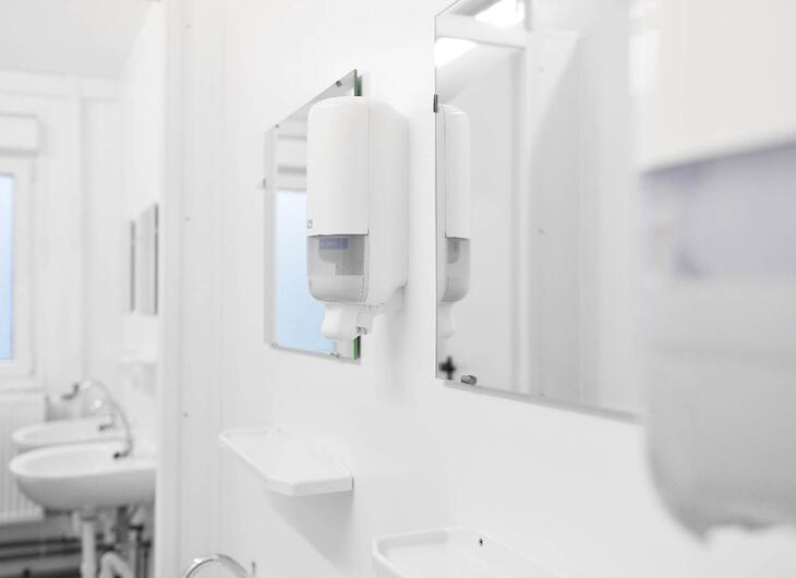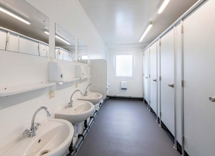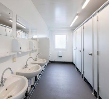 ELA Sanitärcontainer gibt es in unterschiedlichen Ausstattungsvarianten und Größen, darunter auch geschlechtergetrennte Sanitärbereiche.