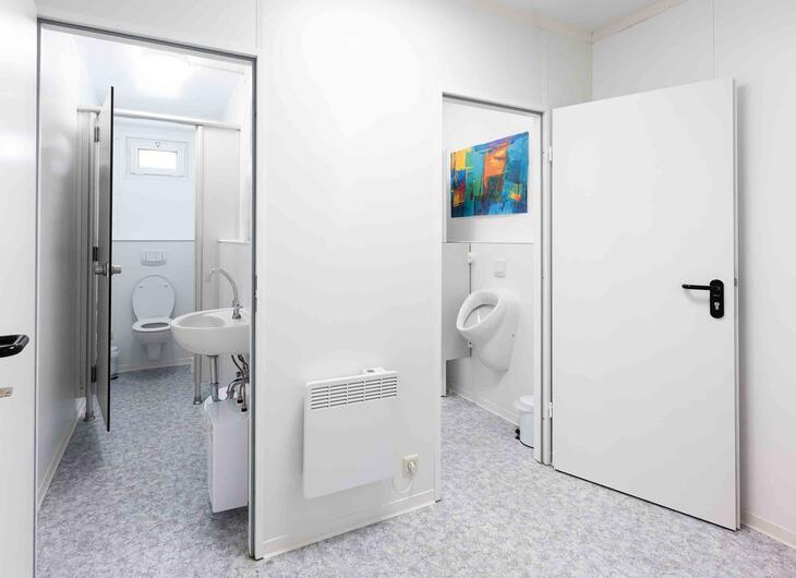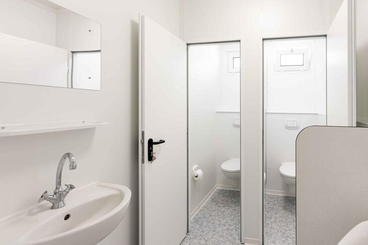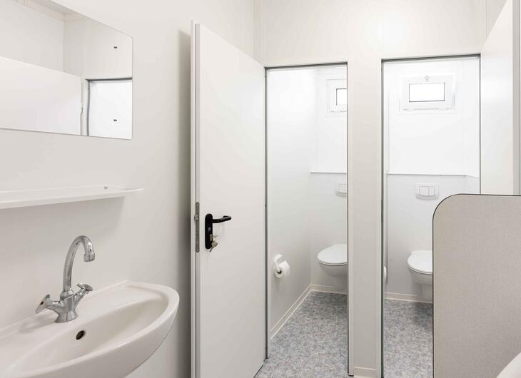 ELA Sanitärcontainer gibt es in unterschiedlichen Ausstattungsvarianten und Größen, darunter auch geschlechtergetrennte Sanitärbereiche.