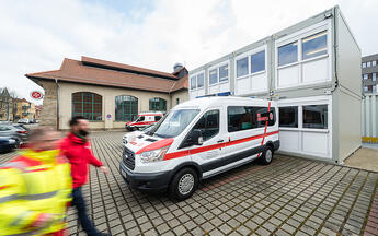 Das neueste Projekt ist eine Geschäftsstelle der Johanniter-Unfall-Hilfe in Dresden. Auf insgesamt 120 Quadratmetern sind innerhalb von nur 14 Tagen nach Auftragserteilung vier Großraumbüros entstanden. Zum Einsatz kommen dabei acht ELA Bürocontainer aus der Serie der Qualitätsallrounder. Die zwei Stockwerke sind über eine Stahl-Außentreppe verbunden. Eine normgerechte Sicherheitsausstattung, beispielsweise mit acht Rauchwarnmeldern, ist bei ELA selbstverständlich. Der Einsatz des temporären Bürosystems ist zunächst für mindestens drei Monate vorgesehen und beherbergt die Verwaltungsmitarbeiter während des Umbaus der Rettungswache.